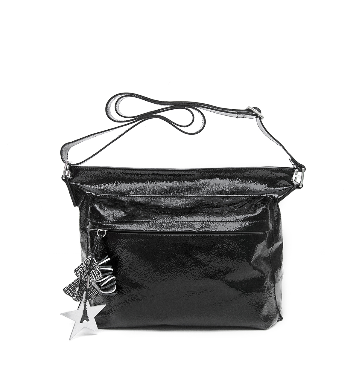Cartera / bandolera de charol noir | Bolsillo exterior | Bolsillo plaqué / porta celular | Mosquetón para llaves | Correa ajustable (de 71 a 133 cm.) | Medidas: 24 cm. x 36 cm.