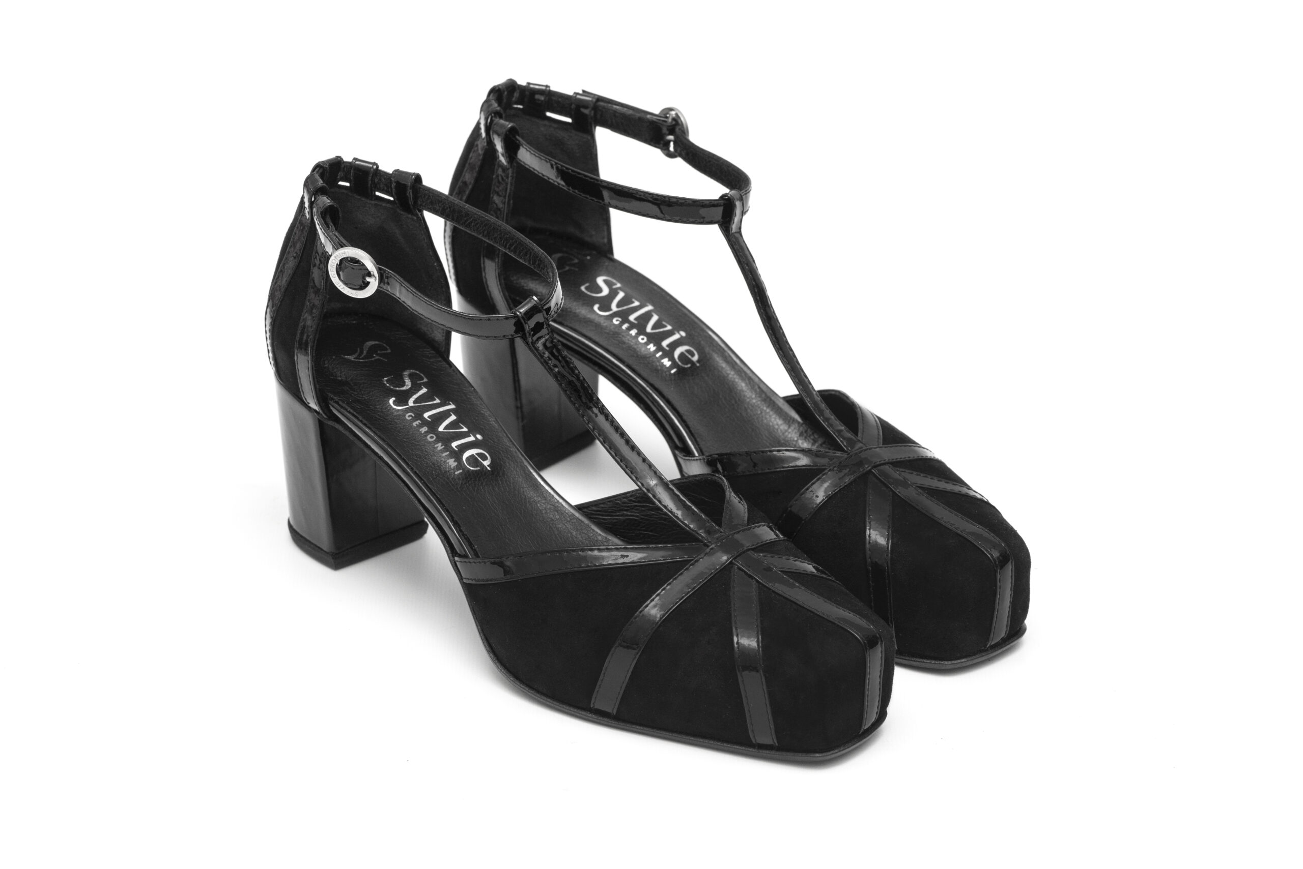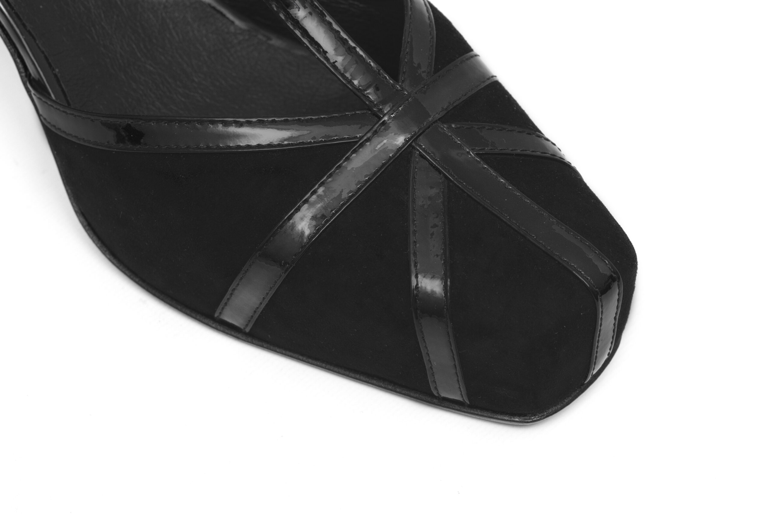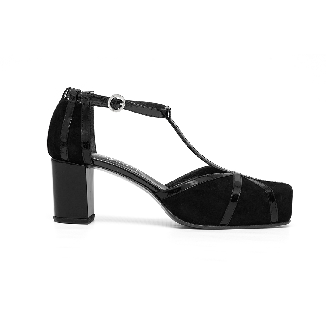 Gamuza negra con tiras de charol: Aporta un acabado neutro y elegante, fácil de combinar.