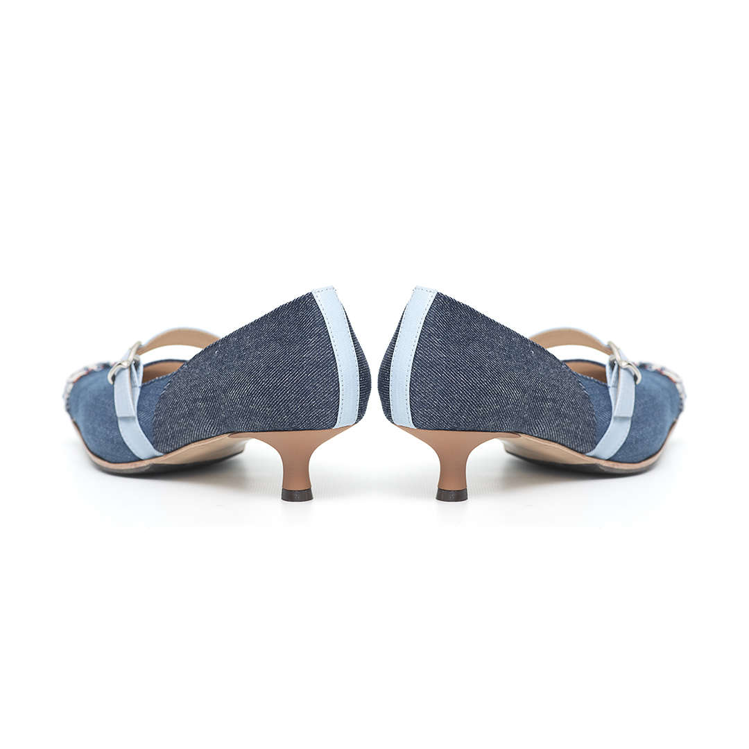 • Pulsera de cabritilla celeste con hebilla cuadrada plateada: asegura firmeza al empeine y suma un detalle delicado y distintivo.