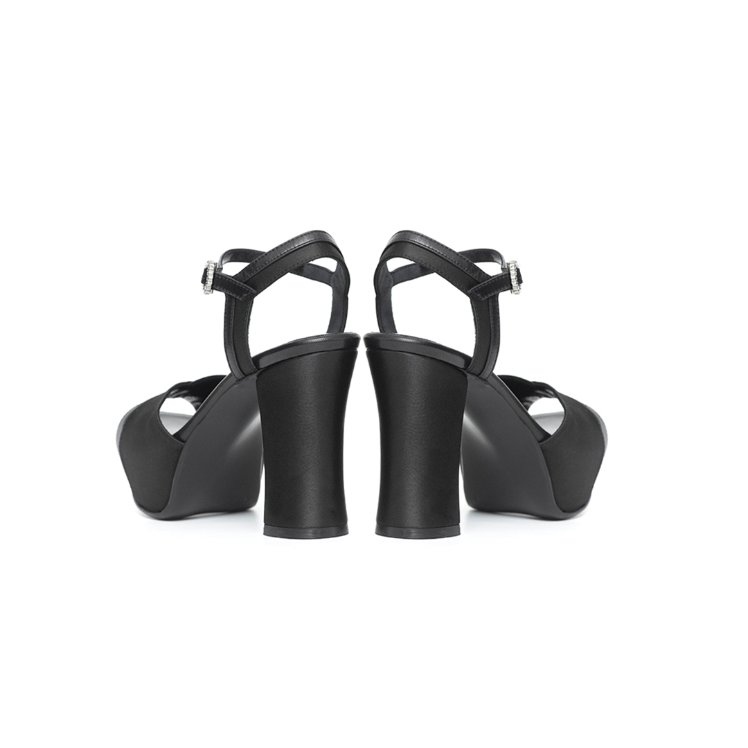 La Justine Bajo Noir es una sandalia elegante y sofisticada que combina la sobriedad del negro con detalles de brillo sutil, pensada para ocasiones especiales donde el calzado marca presencia con distinción.