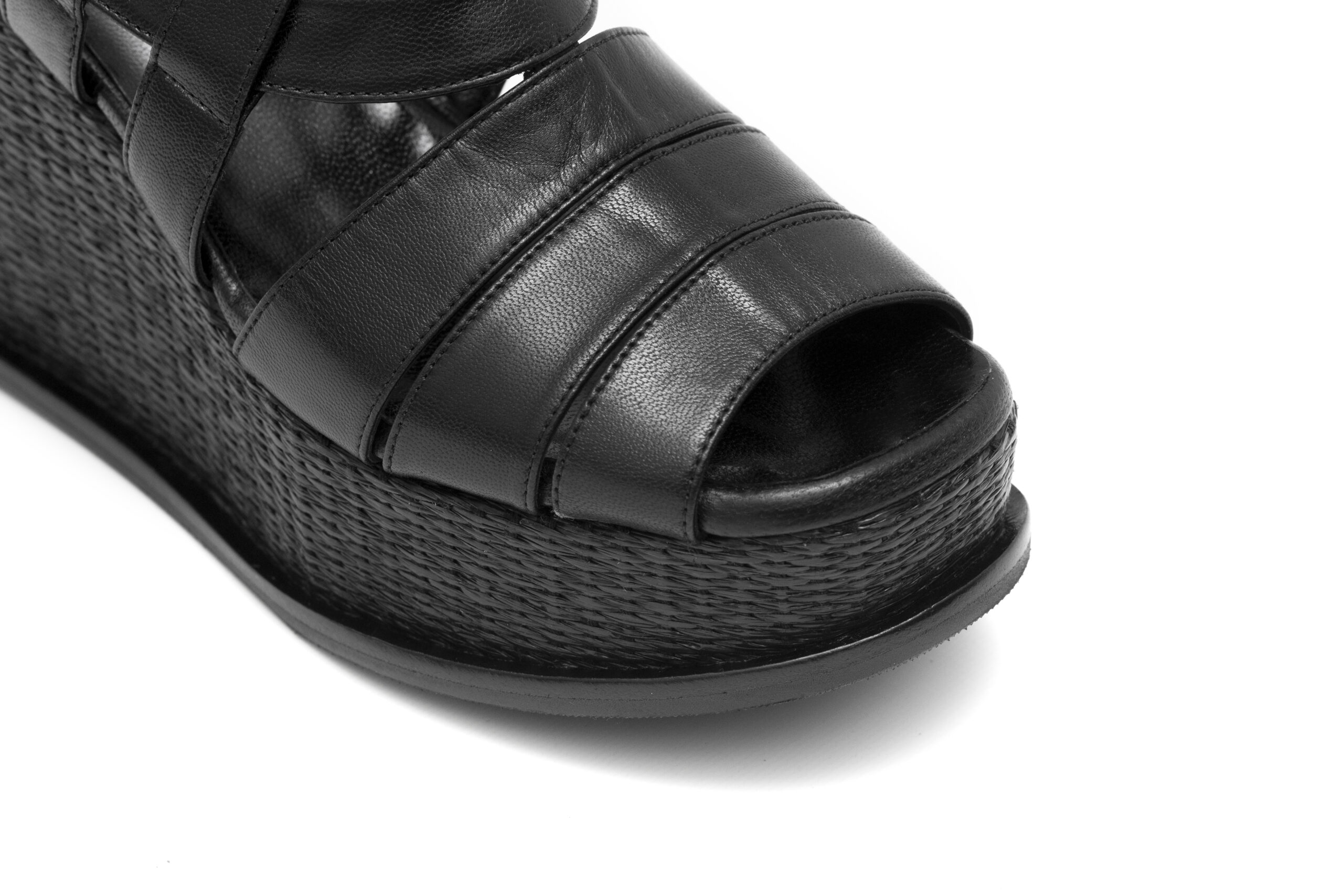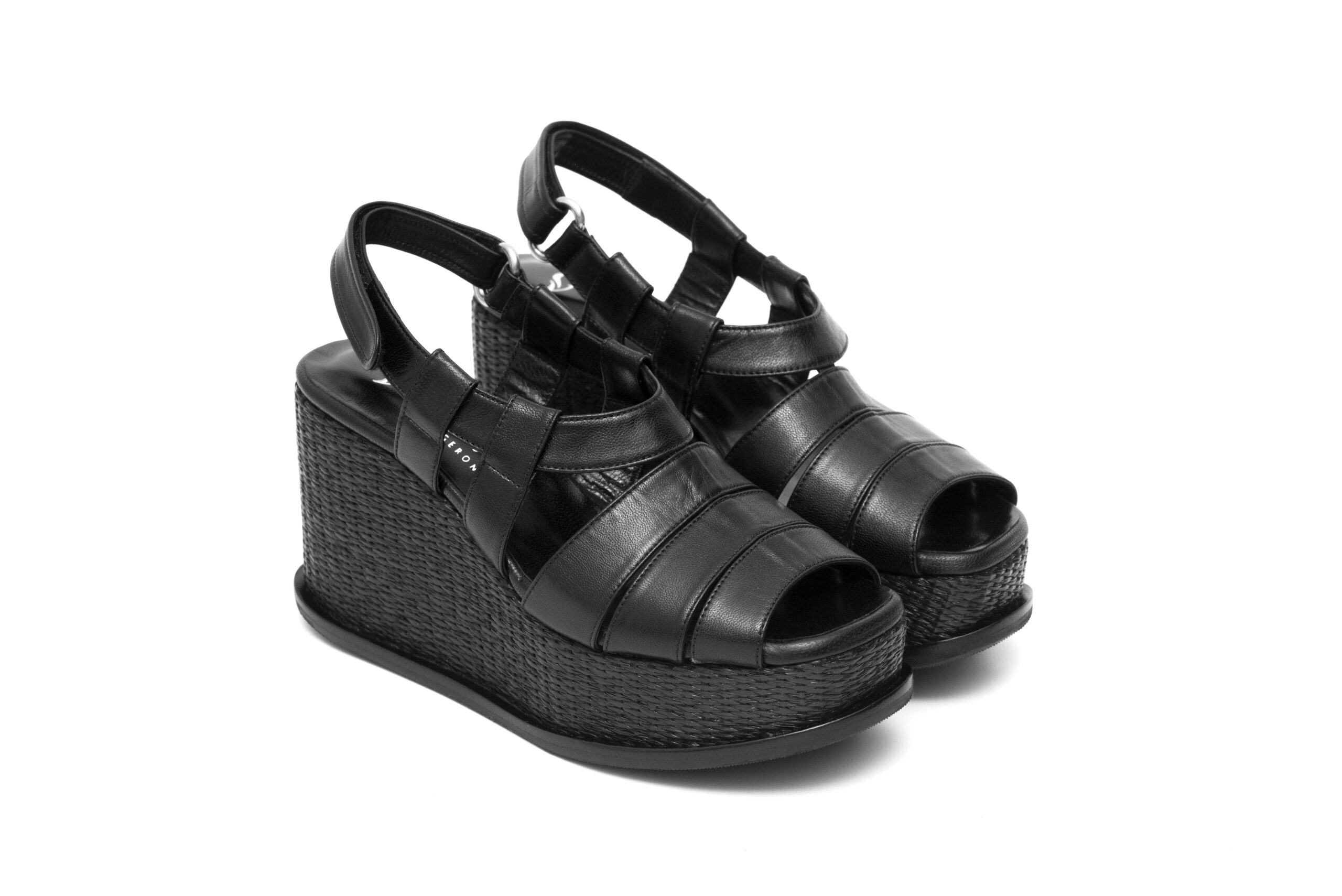 Su base negra texturada aporta presencia y un carácter urbano definido, mientras que la capellada de tiras en cabritilla negra plena crea un diseño limpio, sofisticado y fácil de combinar.