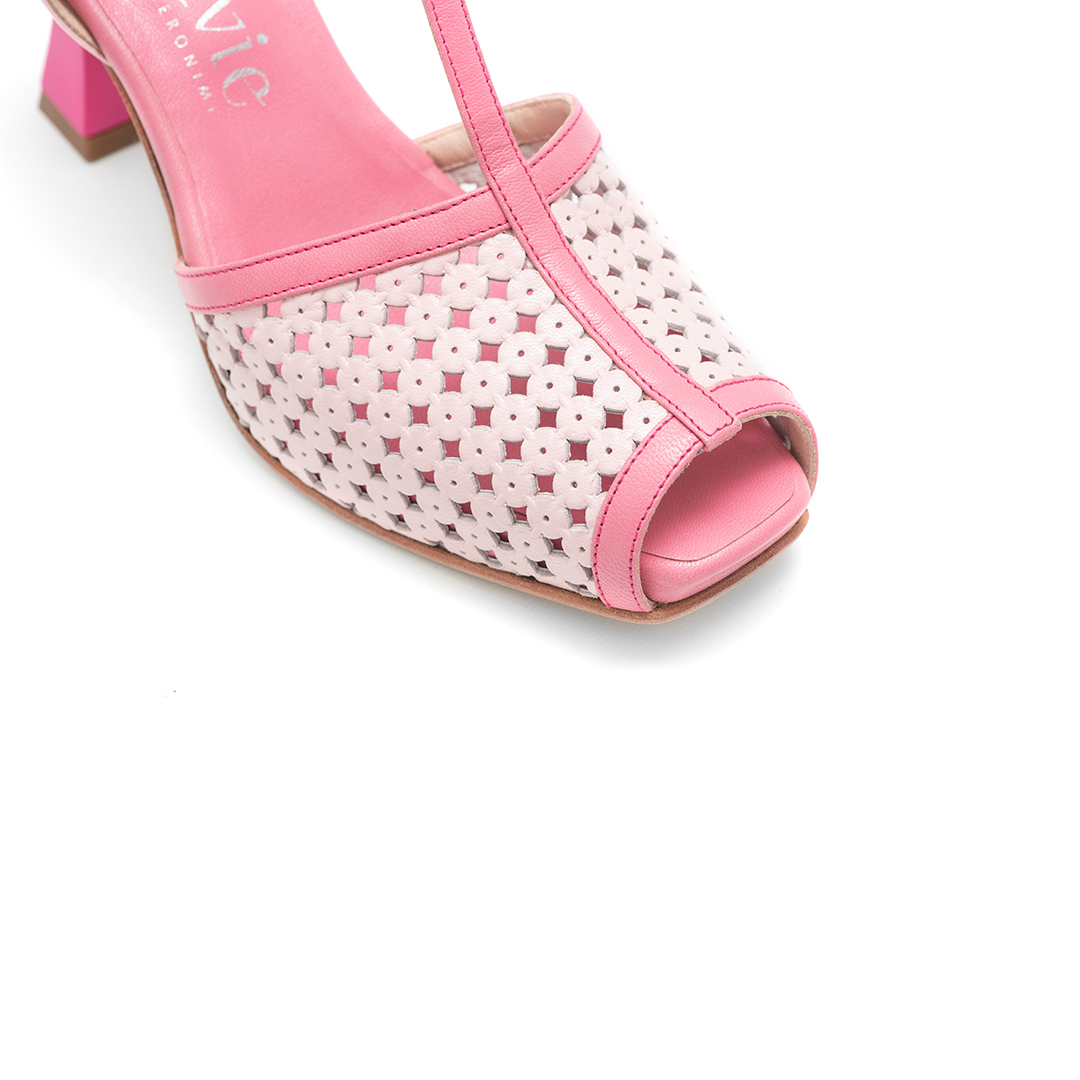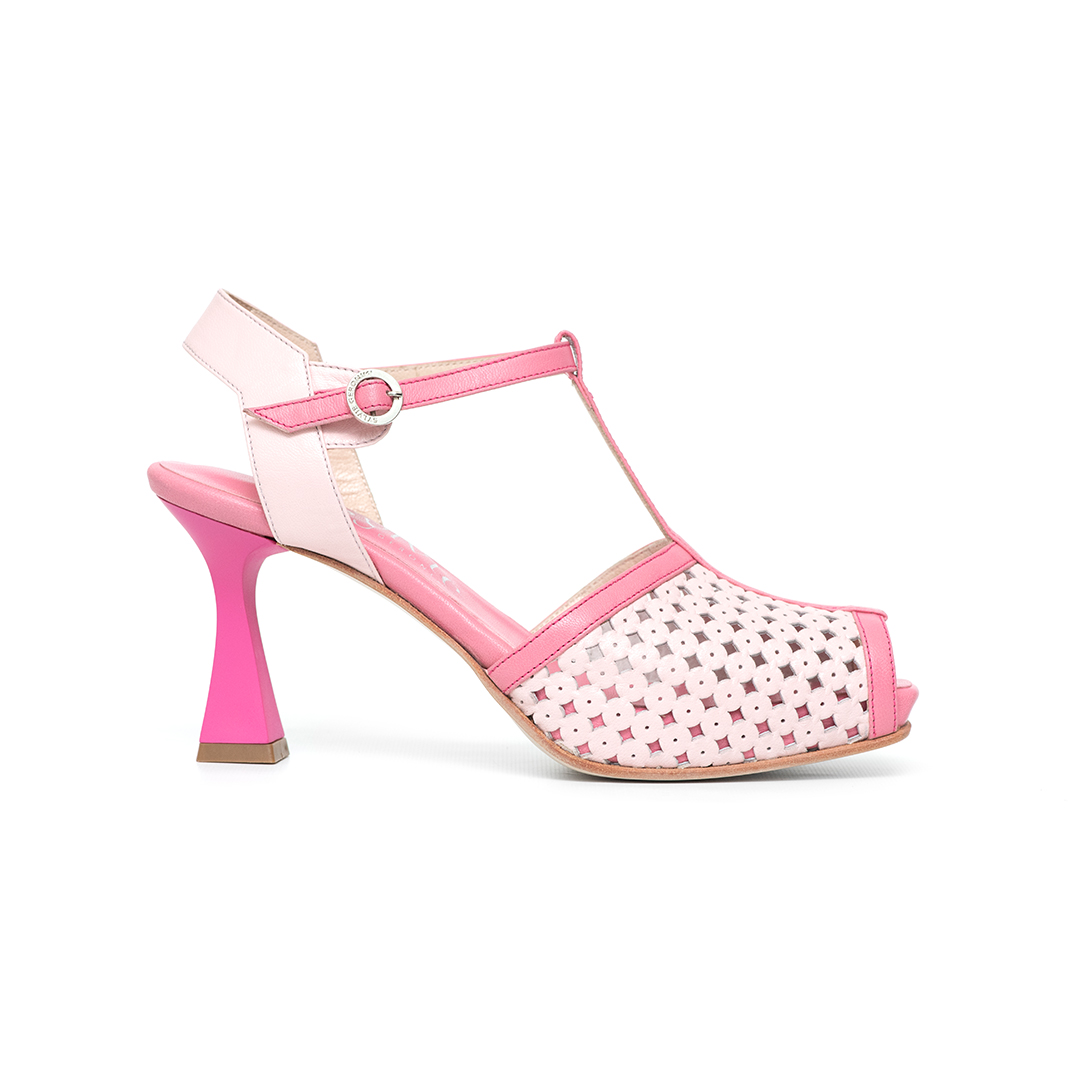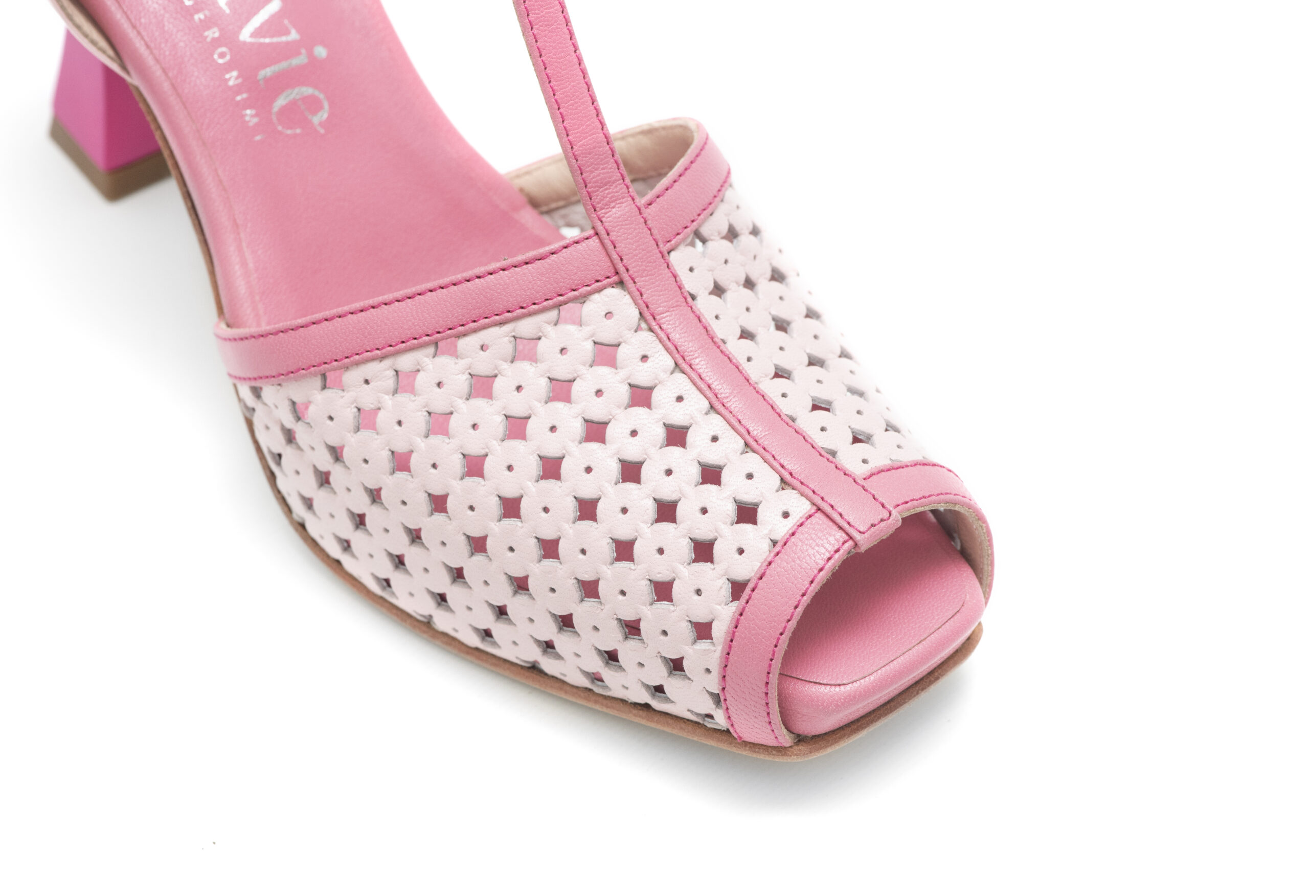 La capellada en cabritilla rosa troquelada aporta textura y ligereza visual, mientras las terminaciones y el T-strap en cabritilla rosa pleno definen la silueta con un trazo delicado y contemporáneo. El talón en rosa intenso suma un acento vibrante que completa la armonía del diseño.