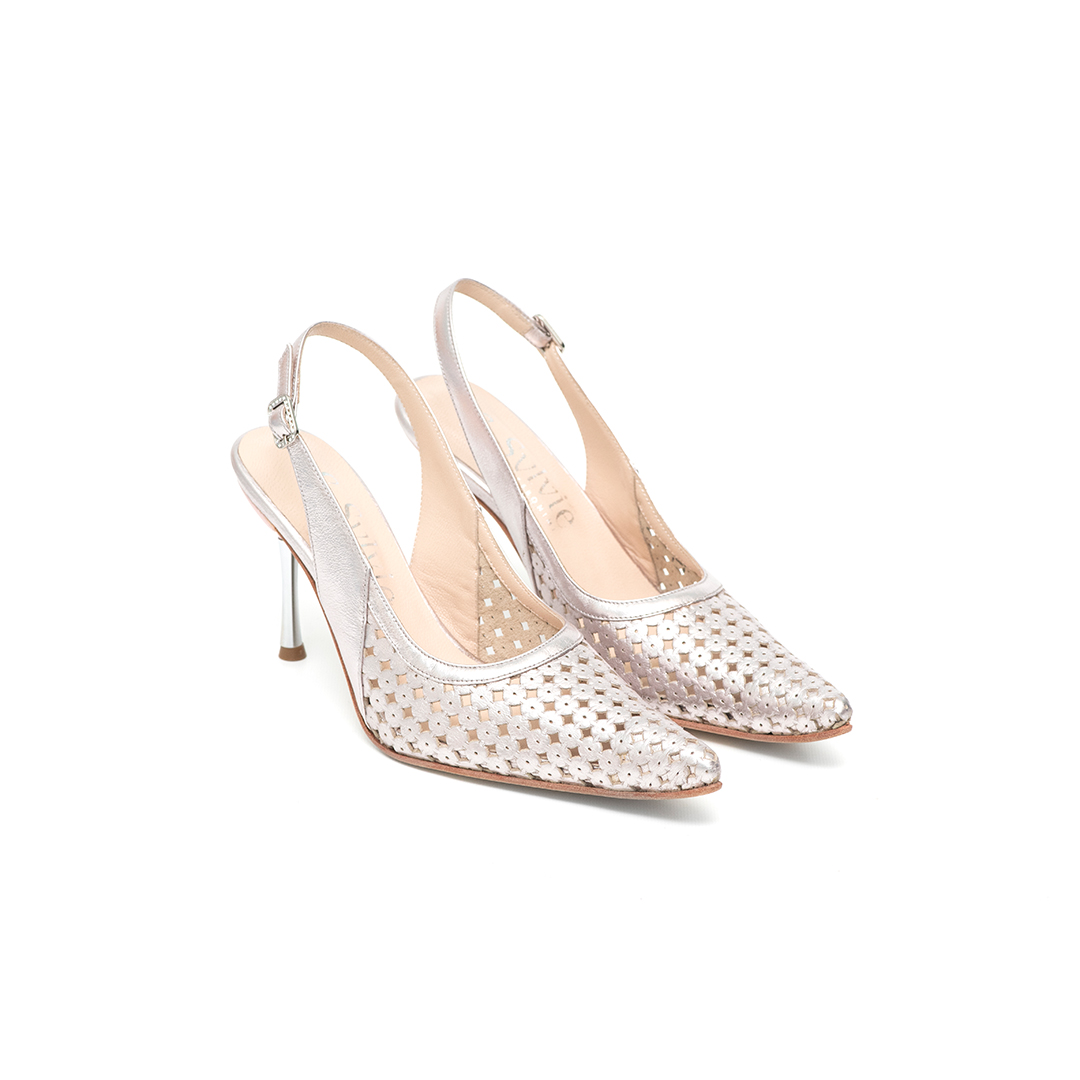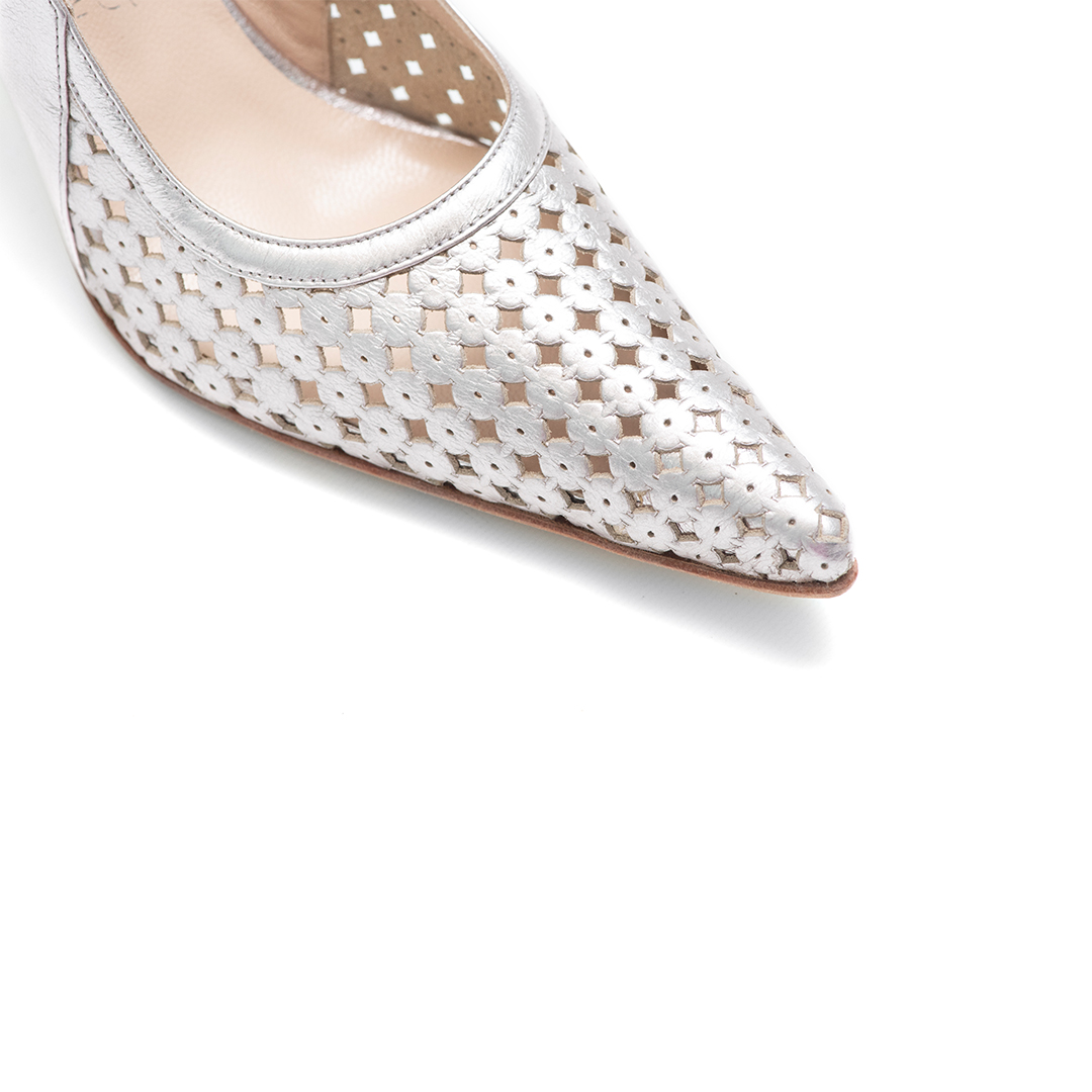 La capellada en cuero plata rosé troquelado aporta ligereza visual y un destello suave, mientras que las terminaciones en cuero plata rosé pleno definen el contorno con precisión y delicadeza.
