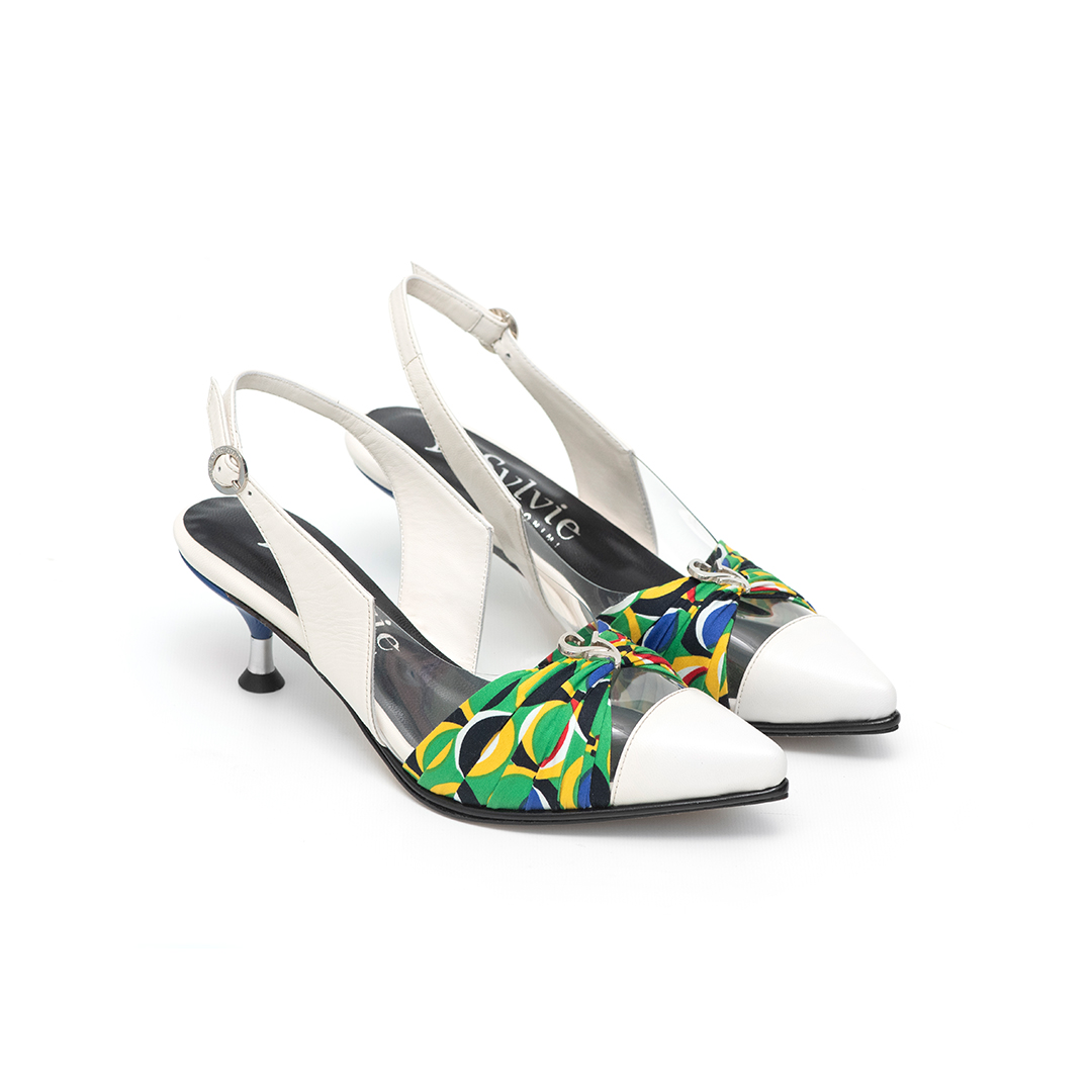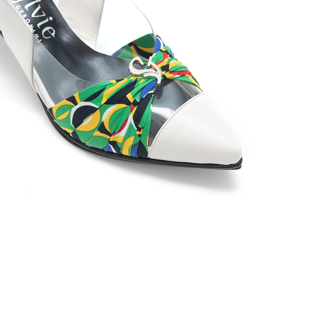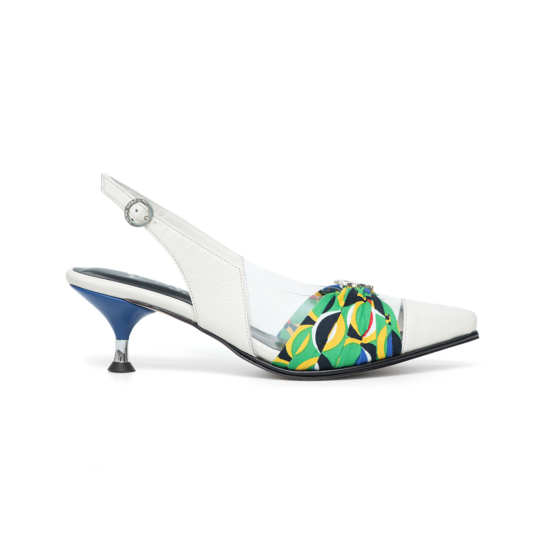 La puntera en cabritilla blanco roto aporta suavidad y definición, mientras el centro en acrílico transparente genera un efecto liviano que estiliza el pie.